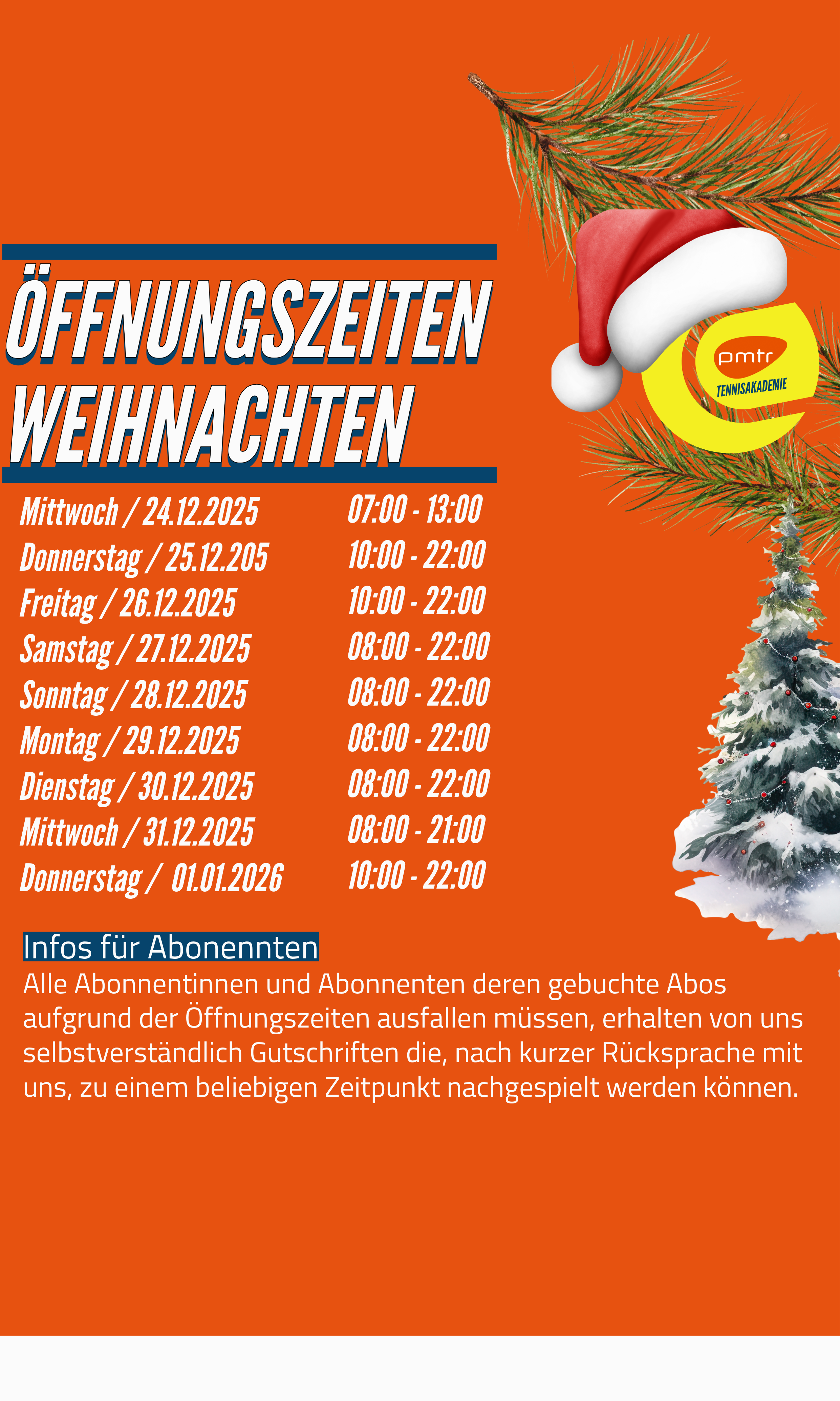 Auch über die Festtage sind wir für euch da. Die vollständigen Öffnungszeiten findet ihr rechts im Bild übersichtlich dargestellt. Wir wünschen euch und euren Familien eine wundervolle Weihnachtszeit voller Ruhe, Freude und schöner Momente. Genießt die Feiertage, sammelt neue Energie und startet gut und gesund ins neue Jahr. Wir freuen uns darauf, euch nach den Feiertagen wieder auf und neben dem Platz begrüßen zu dürfen. Frohe Weihnachten und einen guten Rutsch ins Jahr 2026!